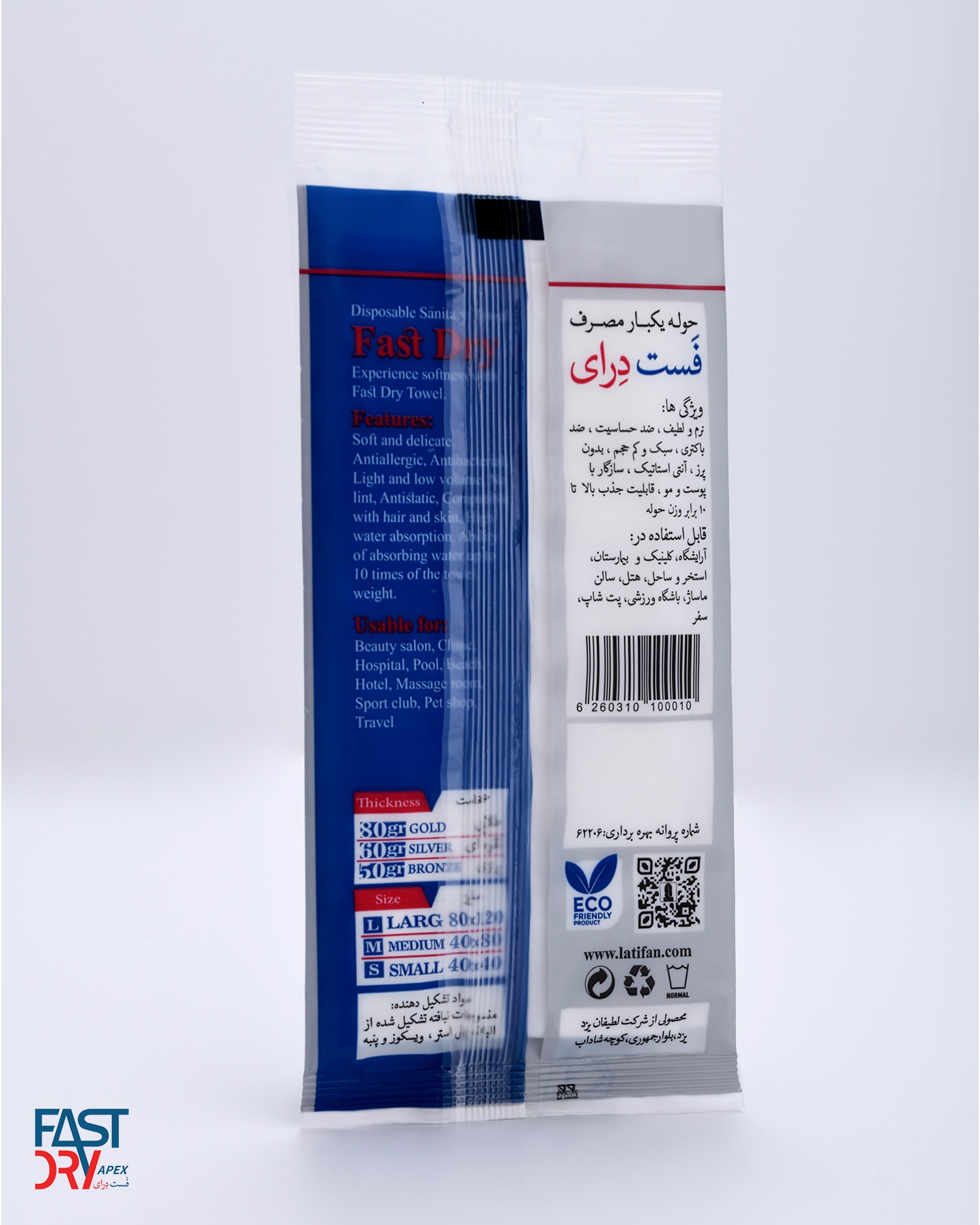 - ویژگی ها : جذب آب سریع و بالا تا 10 برابر وزن حوله، نرم و طلیف، ضد حساسیت، سبک و کم حجم، بدون پرز، آنتی استاتیک